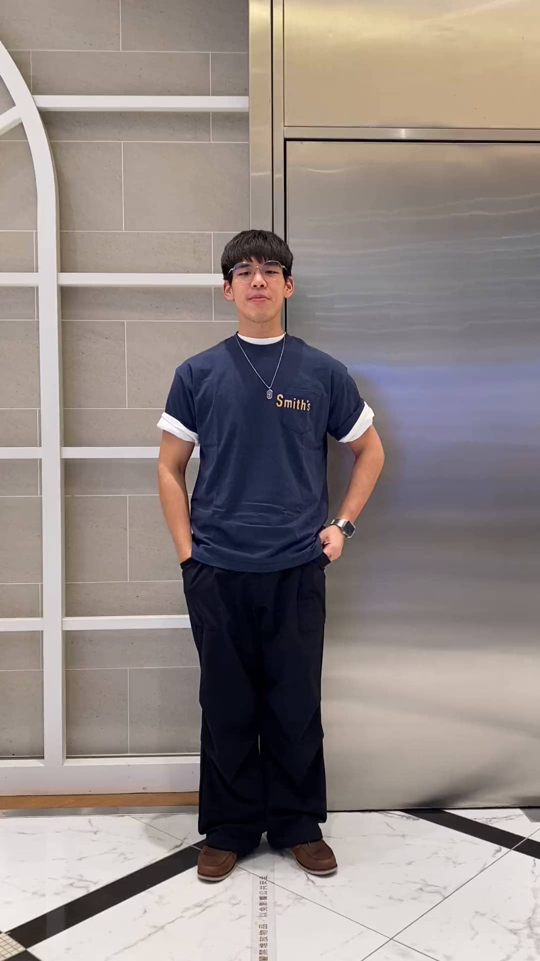 上半身是深藍色短袖T恤,版型偏寬鬆,袖口反摺露出內層白色,做出層次感,也讓單一色系不會太單調。胸前史密斯小字樣增加一點細節,但不搶戲,整體還是很俐落。