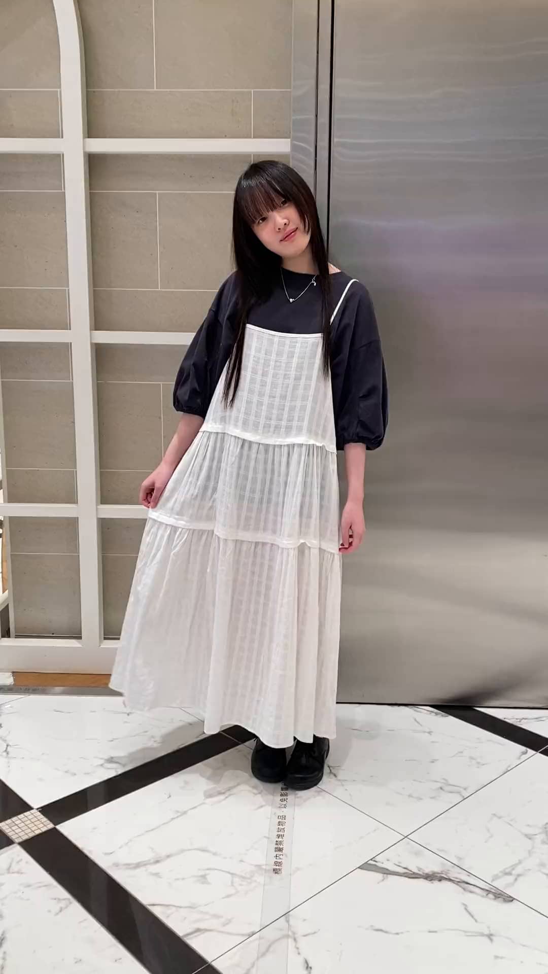 白色格紋蛋糕吊帶裙內搭灰色澎袖上身