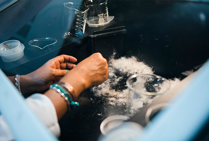 按照法定標準來檢測穿不到的外套、睡袋、枕頭等回收來的羽毛資源,提供生產高品質再生羽絨的研究發展。