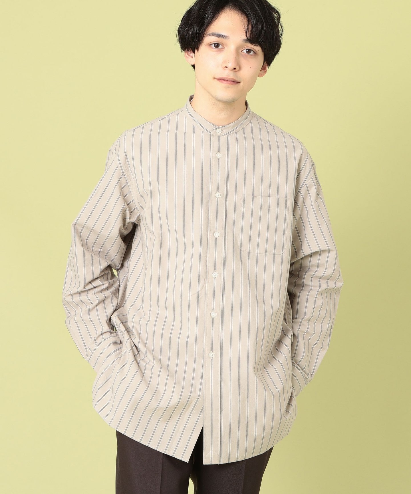 如同古著般色斑的特色款直條紋無領襯衫,乾爽的觸感、擁有近似多次清洗過後的質感的印度棉,下擺的長度比以往來的更長一些,最適合搭配背心或衛衣等層次的風格。