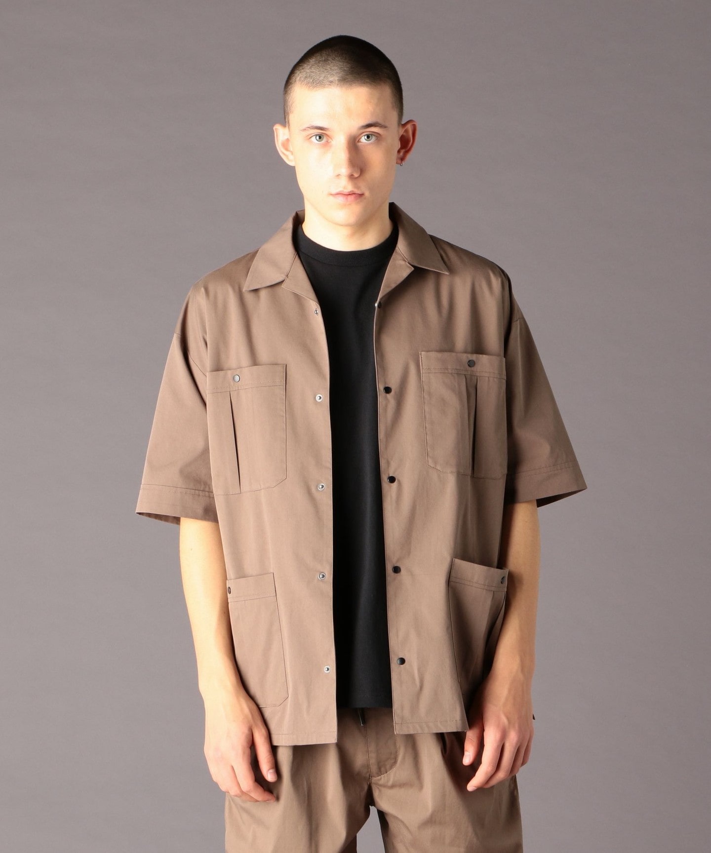 正面四口袋的特色款開領襯衫。壓釦與類似於古巴襯衫的口袋細節都給人都會感的形象。剪裁上的貼身度是較為寬鬆。推出的花色為UTILITY LINE系列形象的黑色、深灰共兩色。
