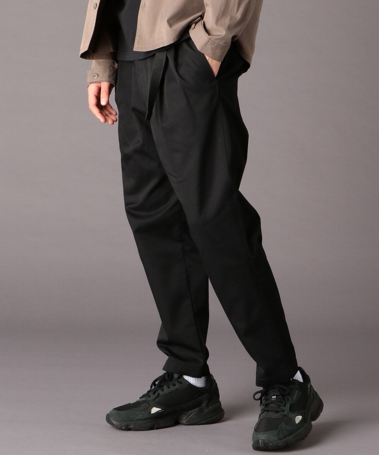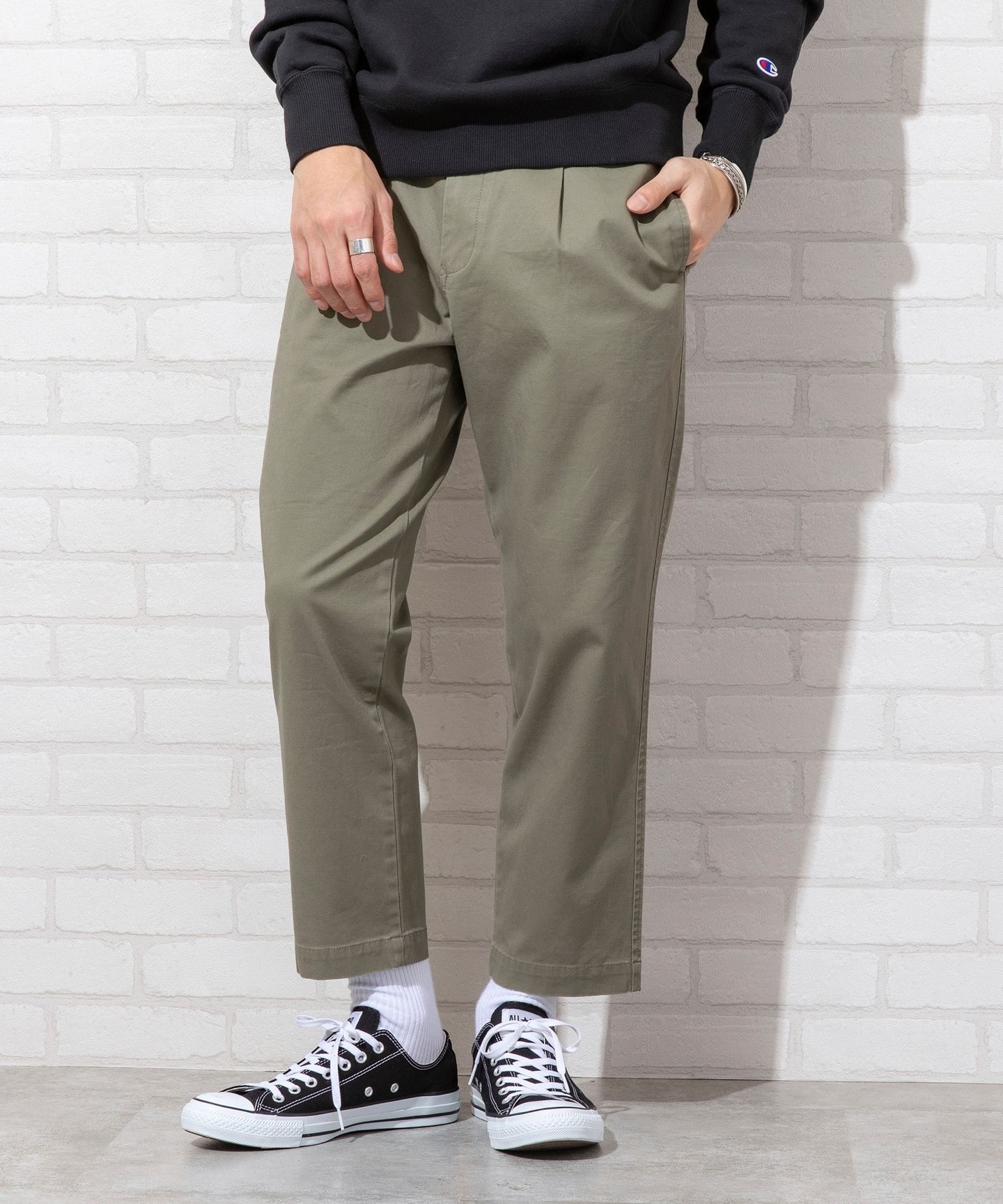 合身錐形打摺CHINO褲。去除掉抽繩等配件,是一款簡約的打摺褲,可以搭配出將上衣下襬紮進腰間的造型。春季的配色共有駝色、橄欖綠與基本的黑色。