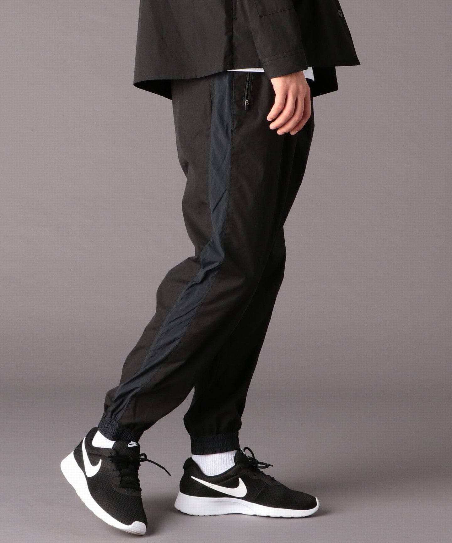 俐落的錐形剪裁縮口褲。用同色的異材質拼接而成的側邊線條是設計上的重點。腰圍處或褲腳的縮口、後口袋使用的也是異材質,讓素色的花色也能有效地展現玩心。