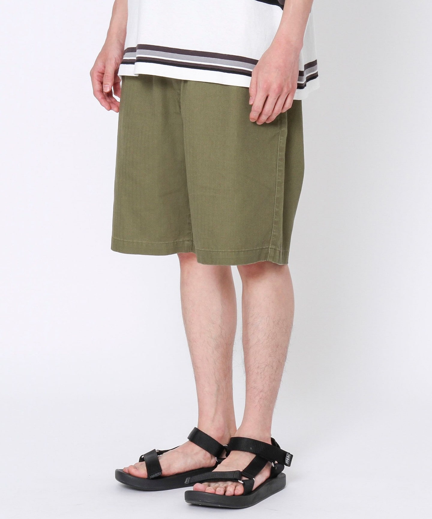 特色在於布料質地的短褲,用人字呢布料縫製成的五分褲,腰圍為鬆緊帶也能用抽繩來調整鬆緊,基本的尺寸感與花色,即便是都會風格也很適合。