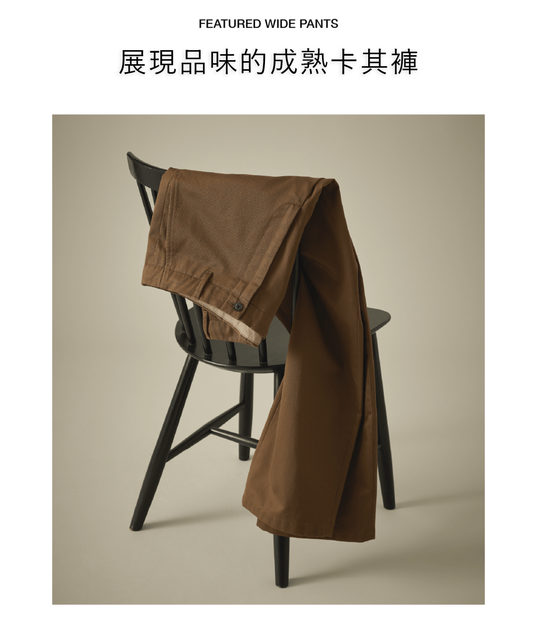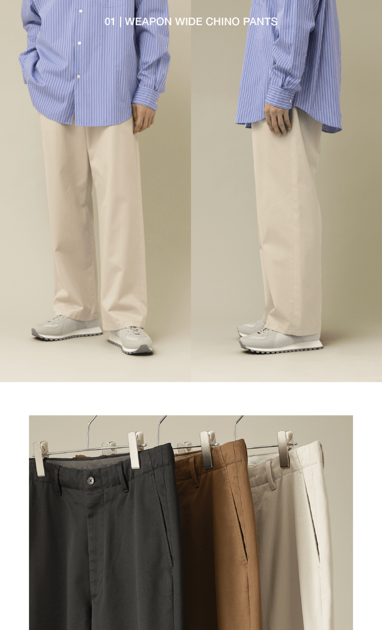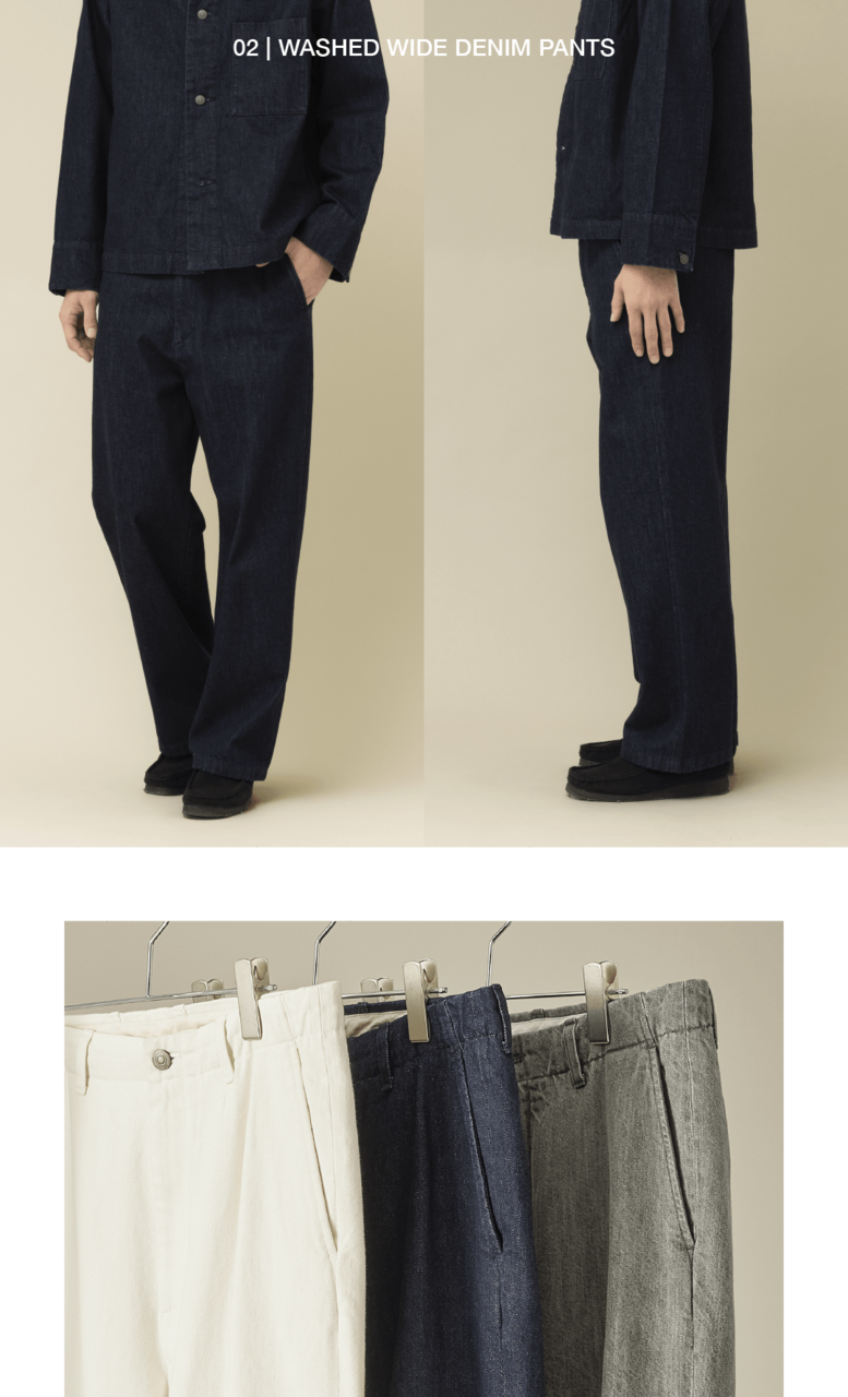 以寬直筒的俐落剪裁,搭配修飾腰線的細節,提升穿著舒適度。採用以 M-43 為基礎的高級卡其布料,比一般卡其褲更具光澤感,呈現成熟優雅的一款單品。